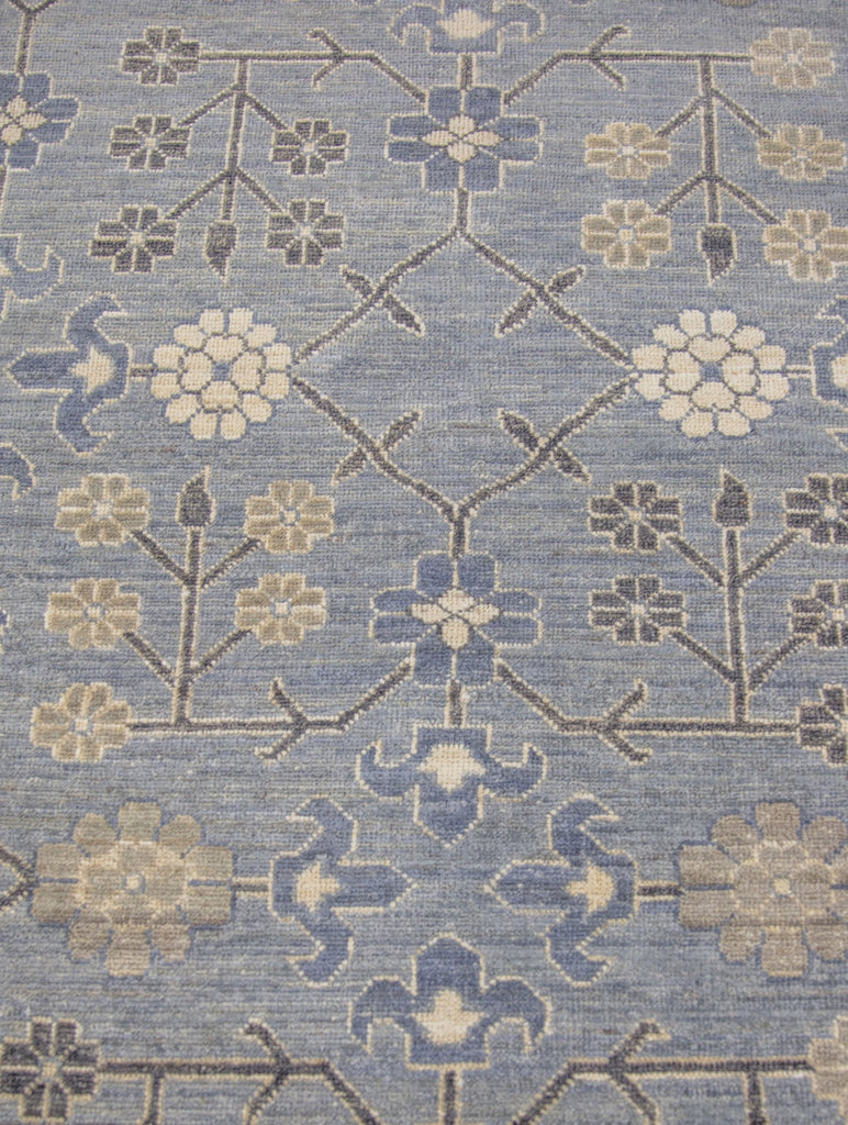 With a mixture of floral and geometric designs, this beautiful one-of-a-kind rug is made my master weavers in Pakistan using high quality, worsted wools. The hand-spun wools used in this rug are dyed to create a beautiful array of colors including blue, charcoal grey, ivory, taupe and beige. Washed and sheared to have a low pile, this hand knotted rug makes for a stunning casual, traditional anchor to any high traffic space; Wether it's a living room, 8 chair dining table or king size bed.